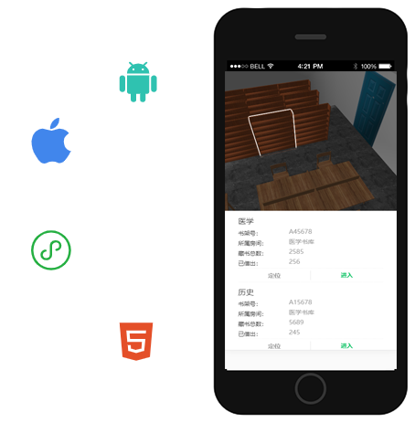 將圖書RFID標簽和室內(nèi)定位技術(shù)、三維模型數(shù)據(jù)相結(jié)合,實現(xiàn)讀者實時在線查閱圖書借閱狀態(tài),圖書位置信息等圖書相關(guān)數(shù)據(jù)。此外,使用圖書定位,一鍵導航等功能可以最大程度上提升“尋書、找書”效率的同時也減少了圖書館管理人員的作業(yè)負擔。